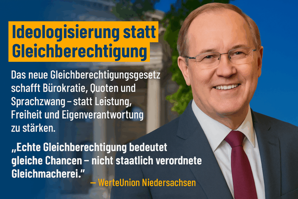 Pressemitteilung Parallelverwaltung für Ideologen: Neues Gleichstellungsgesetz schafft teure Posten Hannover, 29. Oktober 2025 –Die WerteUnion Niedersachsen warnt vor dem Gesetzentwurf der Landesregierung zur „Gleichberechtigung von Frauen und Männern im öffentlichen […]