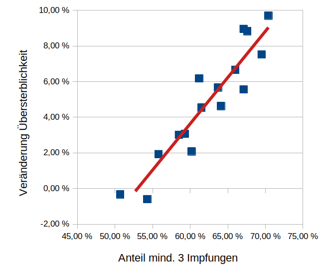 In der Auswertung nach Bundesländern zeigte sich ein auffallend positiver Zusammenhang zwischen Impfquote und Übersterblichkeit: