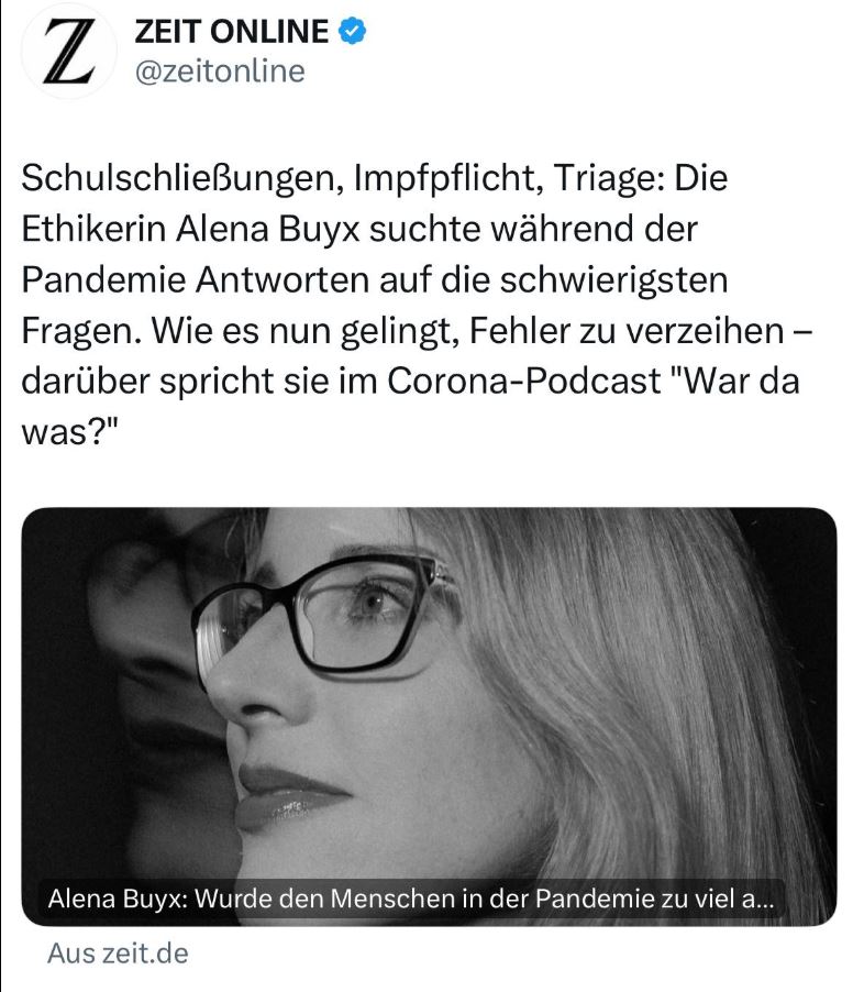 Dabei war Prof. Buyx nicht bloß Kommentatorin, sondern eine zentrale Akteurin: Als Vorsitzende des Deutschen Ethikrats unterstützte sie viele der umstrittenen Maßnahmen aktiv oder legitimierte sie öffentlich. Der Versuch, sich heute durch allgemeinphilosophische Betrachtungen zur moralischen Deutungsinstanz der Aufarbeitung zu stilisieren, wirkt daher nicht wie echte Reue, sondern wie ein Strategiewechsel.